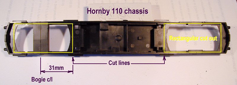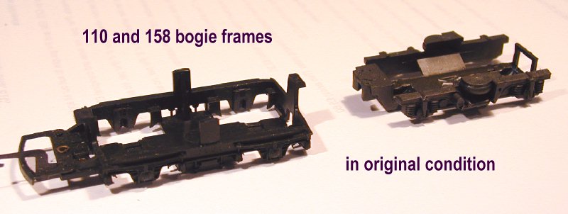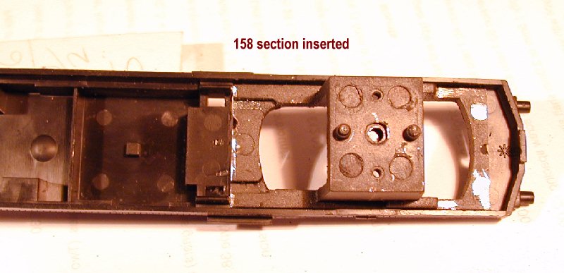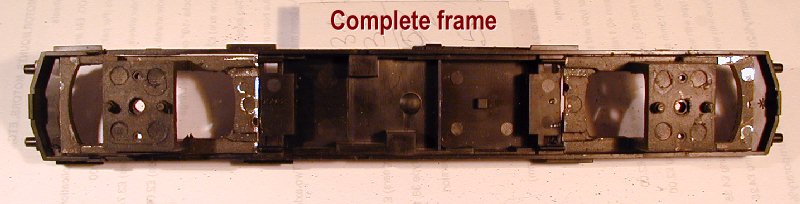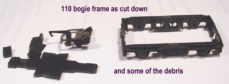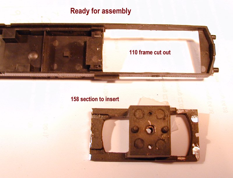 With two working bogies things start to look hopeful, next step is to fit the bogie pivots in the chassis, the relevant bits are cut from the Bachmann chassis and the Hornby chassis cut out to recieve them, with care this also can be a push fit needing no other fixing, just plasticard strips inside the Hornby chassis to keep the Bachmann parts in position.