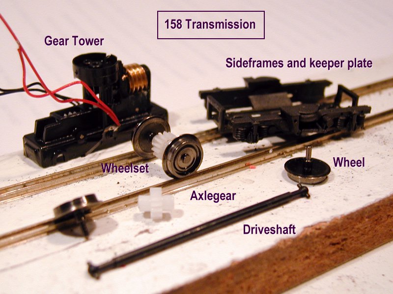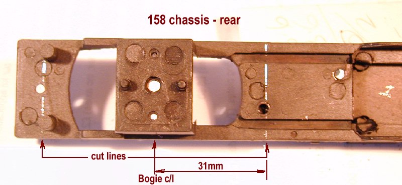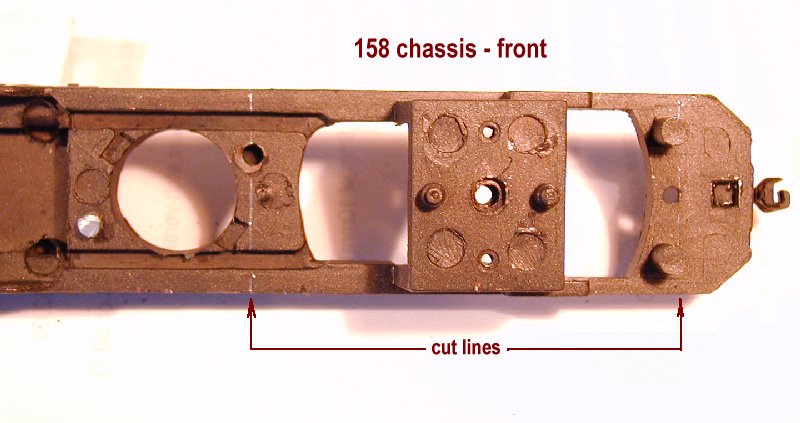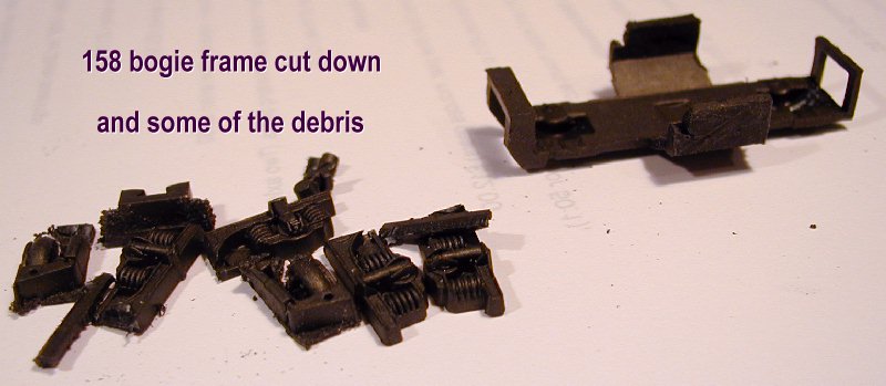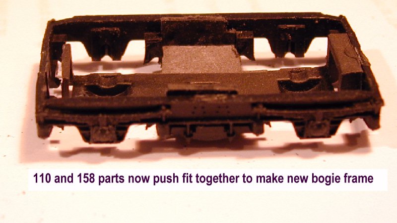 Next puzzle is the bogie sideframes, the class 158 sideframes need to be replaced by the Hornby DMU sideframes. Quite a lot of pondering done here before it became clear where to cut, done right the two bits are a push fit together and won't need any other fixing.At this point clip the keeper plate back on the gearbox and check that the axles are still free,(the driveshafts should spin freely in the fingers), most likely they will be very stiff as the keeper plate clamps on the bearings, if so then the bearings are not fitting far enough into the gearbox, do a bit more work, gently with a round file till you can clip the keeper plate on and everything runs free.