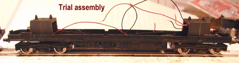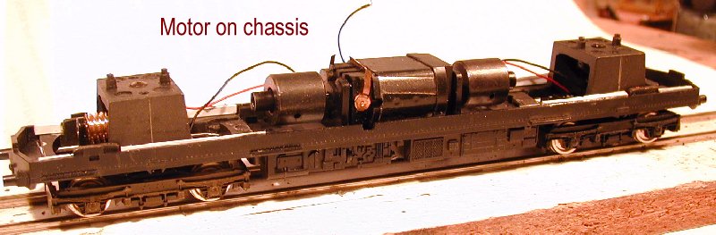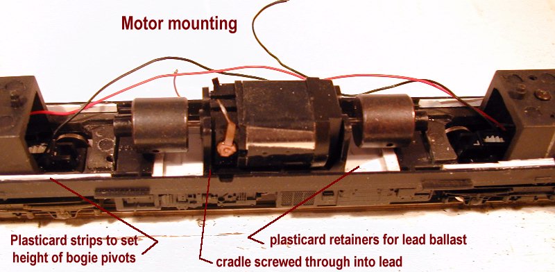 The motor should be fitted as low as possible in the centre of the chassis, the flywheels should just clear the crossmembers at each end of the central well, to achieve this the bottom of the well is packed with lead sheet until the motor, in its cradle sits at the right level. The lead should be held in place with strategically placed plasticard strips and the cradle fixed down to the lead with the self tapping screws that originally held it to the Bachmann chassis.