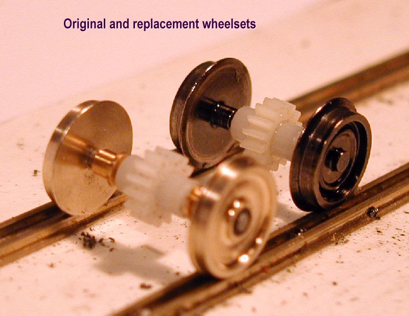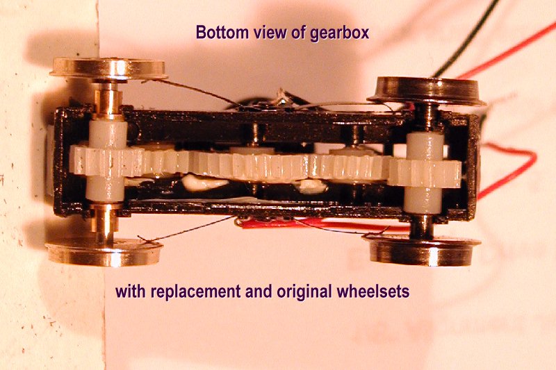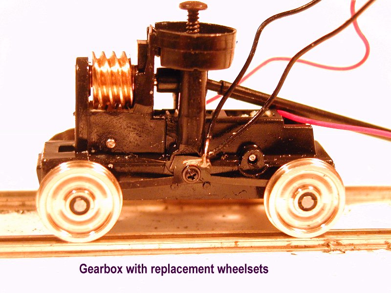 If you try to fit the bearings to the gearbox as is they are too big and the box will distort. The axleholes in the gearbox need to be opened out to a 'just tight fit' I did this slowly and carefully with a round needle file, need to be specially careful to maintain the centres as the hole is a keyhole rather than a complete circle and its easy to move the centre towards the keyhole gap. When you have the fit right clip the wheelsets in. The pickup wires need tweaking to rub on the wheel backs.