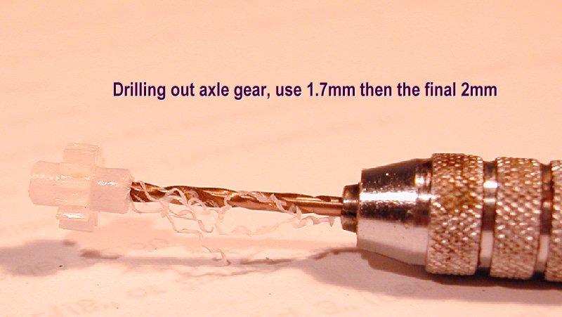 First essential for P4 is to deal with the wheelsets. Ultrascale do a drop in wheelset but this is the small diameter for the 158. I needed 3ft. wheels for a dmu. At first look the Bachman wheelset looked problematic, it comprises two half axles inserted in a gear/muff (ideal for split axle pick up but even so Bachmann use wipers) the bearing area of the axles is 2.63mm diameter and the inserted section only 1.6mm. To use standard 2mm axles I would need to find suitable bearings to match the axles to the gearbox and drill out the gears to be a push fit on the axle.