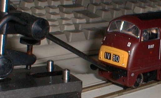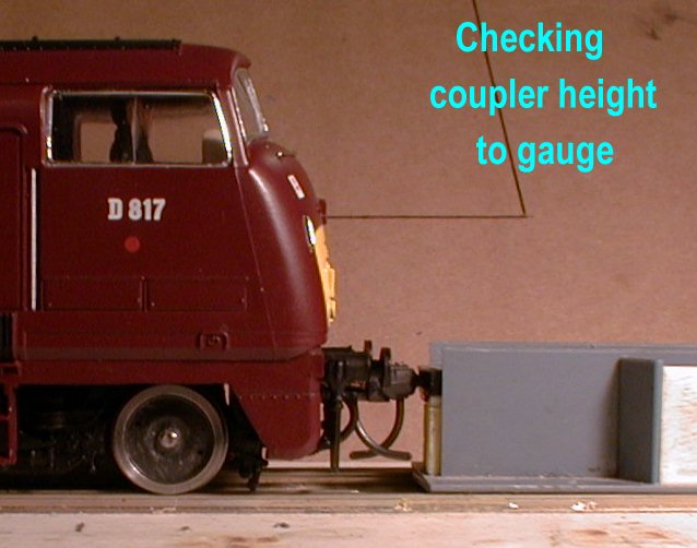 This first photo shows use of a height gauge to check the required height on the buffer beam. My standard is to set the coupler centreline 12mm above rail. This corresponds to the NMRA standard for 4mm scale. This is a little below scale height for UK practice as applied to Mark 1 coaches etc. but allows the somewhat overscale Kadee knuckles to fit comfortably under the gangway centre buffers. | |