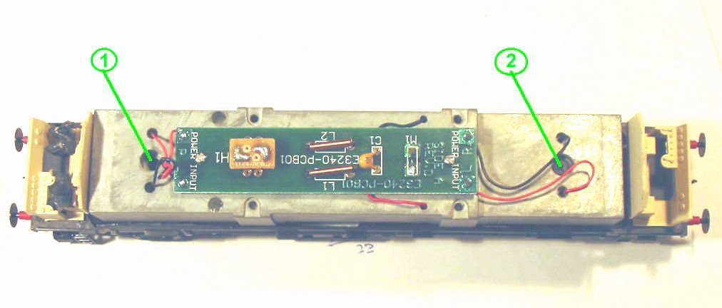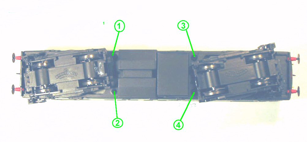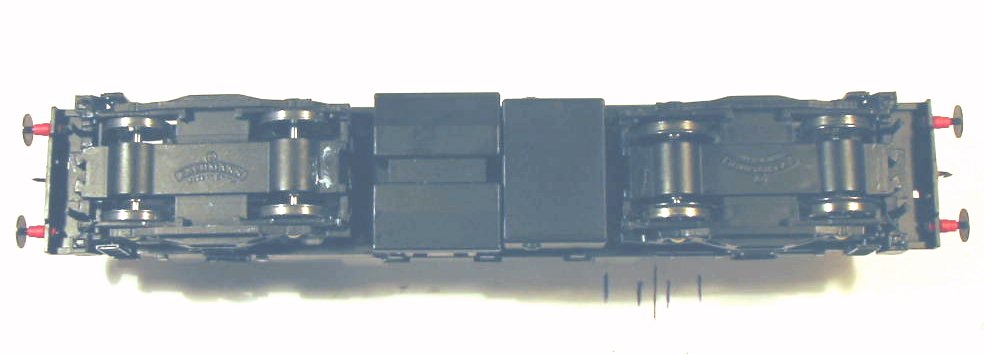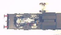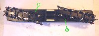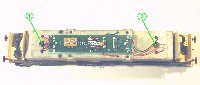 beam at each end. For the class 44 there are only two screws as shown in the second photo, and in this case no clips so the shell lifts straight off once the screws are out. All these screws are of the crosshead pattern but I have not found the crosshead drivers to fit well and have used a jewellers flat blade driver with more success. Once the shell is off bogies can be released by removal of the pivot screw shown in photo 3. I suggest removing only one bogie at a time. There is no need to remove the wires from the circuit board as there is enough slck to work on the bogie. (Note: if the bogies are removed from the 44 its a bit of a juggle to get the drive shaft back into place, if this worries you leave the bogie in place, it just needs a bit more care to unclip the bogie frame. The outer cosmetic frames are fixed to the inner gearbox by a clip at each end. For the 24/25 I have found it easiest to unclip from the outer end using a small screwdriver. For the 44 the pony truck should first be unscrewed as the screw helps retain the outer end of the cosmetic frame, then unclip from the inner end. With the bogies fully rotated this can be done fairly easily without releasing the bogie. When the cosmetic frame is released the inner idler wheels will likely drop out along with their bearing saddle and spring, keep the bearing saddle and spring safe for use when re-assembling.