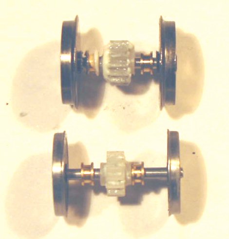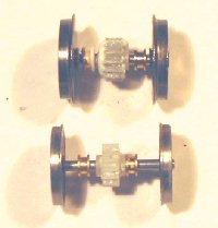 The first action is to recover the gears and bearings from the Bachmann wheelsets. The bearings are a clip fit into the gearbox and a little pressure from the fingers will pop the wheelsets out, or you can apply a bit of leverage with a screwdriver between bearing and gear, whichever way be careful not to disturb the pick ups. The wheels and bearings can then be removed and the gear pressed off the axle, the axles are knurled under the gears so press them straight off without twisting. I use an NWSL wheel puller but you can use your favourite method. Keep gears and bearings safe for re-use.