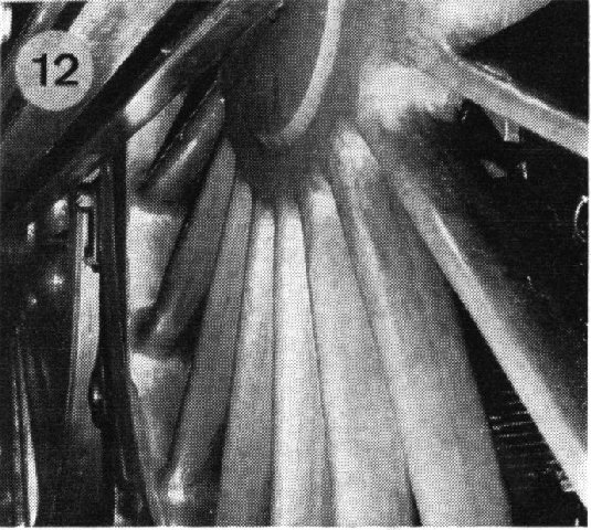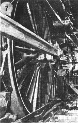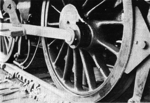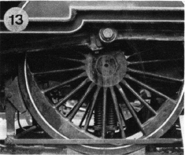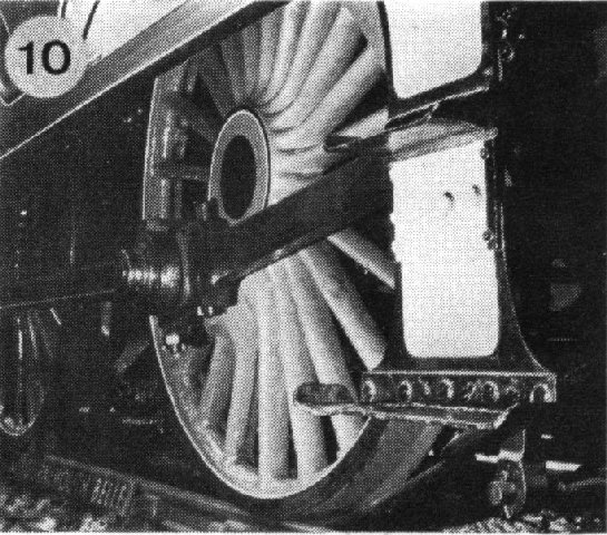 12. L.N.E.R. A4 Pacific driving wheel showing the limited clearances between coupling rod and wheel face and the flaring of the spokes into the wheel boss. | 13. The combination of crescent and plate balance weights on the driving wheels of a Midland Compound. |