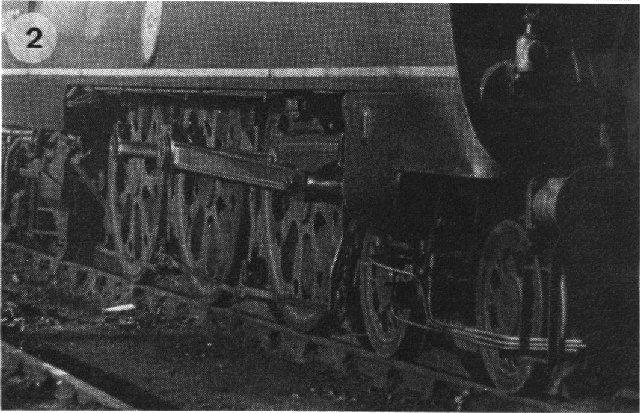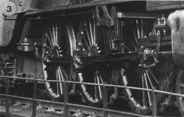1. Driving and bogie wheels of G.N.R. Large Atlantic No. 301. Note the flare of the spokes, the close spacing of the drivers, the flush-ended crank pins, and the size of the connecting rod big ends far wider than in the average model. | 2. Bulleid Firth-Brown wheels on Southern Pacific No. 34057. | 3. The rear-face tapered wheels of L.N.E.R. Pacific No. 60156. |