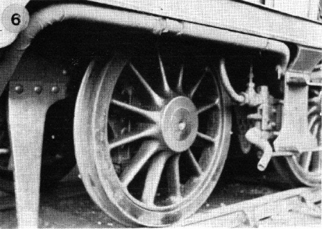 4. L.B.S.C.R. 0-6-2T Driving wheel with pear-shaped crank boss and axle end with centre-pop mark. | 5. British Railways standard 9-spoked bogie wheels. | 6. L.B.S.C.R. 0-6-2T trailing wheel. Note the pronounced flare of the spokes into the boss. |