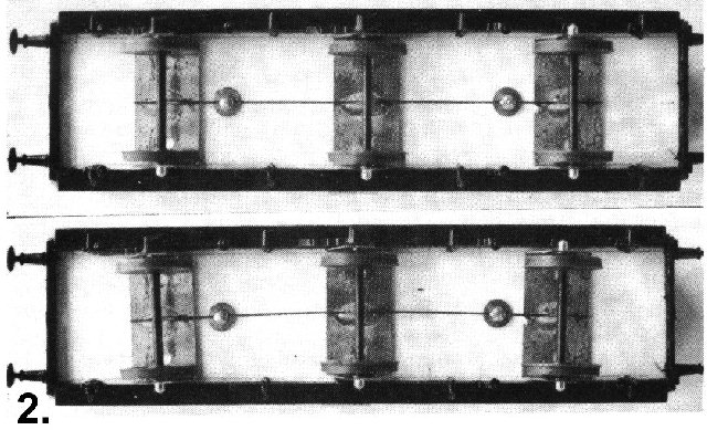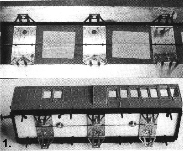 1 A simple jig to ensure correct suspension unit alignment during assembly. The upper metal bar is fixed tothe base,the lower unit held against the assembly. The 0.5 mm wire is taped to the base and so prevents the wire from displacing while it is soldered. The lower part of the photograph shows the method of mounting the units in the vehicle underframe. | 2 The units and their relative positions on straight track and on curves. The underframe has 26mm clearance between the solebars. Note that the end units are flexed by the wire and that two axleguard mouldings have been added to the units. |