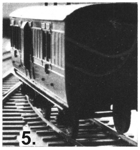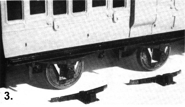 The wheel angle in locomotives is determined from the length of the fixed wheelbase, but in certain cases, the effective wheelbase is the critical figure, For example, the LSWR M7 0-4-4T has a nominal driving wheelbase of 7ft. 6in., but the effective wheelbase is from the bogie pivot to the leading axle, i.e. 20ft. 5ins./81.7 mm. In the same way, a Dean Single has the same effective wheelbase as the GW's 4700 Class 2-8-0's! Although wheel angle is a serious problem in model locomotives, it is usually sideplay which offers the greatest difficulty. Six-wheeled carriages are now very rare, but there is an increasing vogue for long-wheelbase four-wheeled express freight vehicles. The BR CCT/GUV with 23ft. 6in./94 mm wheelbase is more critical in terms of wheel angle than most locomotives. The use of Compensated Suspension units in long-wheelbase vehicles gives them a considerably enhanced performance. In six-wheeled vehicles, the units may be used not only to follow track irregularities, but to cause the end wheel sets to swivel as the centre axle displaces sideways. This is achieved by mounting the three suspension units on a wire, which in turn is located in the slots of two 8BA screw heads set into the vehicle floor inboard of the outer units. Sideways displacement of the centre unit on the 0.5 mm wire causes the screw heads to rotate, and so to give the end units a combined slewing and rotating motion in the opposite direction. This characteristic enables six-wheeled vehicles to be run safely around curves well below the nominal minimum radius. To stabilise the vehicle, the end units are given a narrow packing strip of Vilene interlining felt, which allows them to slide across the underside of the floor. The centre unit is suspended only by the wire, and so it can rotate on its torsion bar , and move both horizontally and vertically to follow the configuration of the track. The accompanying photographs show this system applied to a typical Ratio passenger vehicle; given a certain amount of weighting, the riding of this vehicle is superb, and the body remains completely stable.