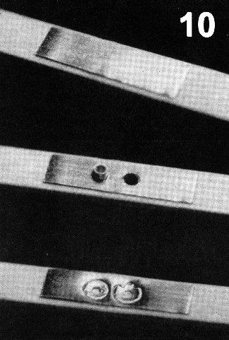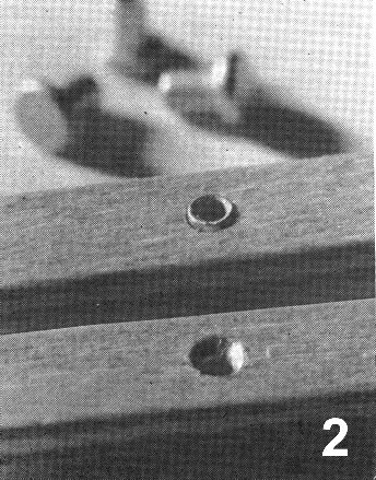 The 0.8mm plywood used for the manufacture of Protofour sleepers is the best material that could be found for the purpose after much experiment. It cuts and punches cleanly, helps to maintain track levels. economises in the use of ballast, and presents an authentic appearance when weathered and laid. Occasionally, prototype track may be unballasted. usually in sidings, and in these locations a full depth steeper is required in the model. Such a sleeper may be made by riveting two standard Protofour sleepers in one operation. using a centre-punch instead of the riveting tool. This expands the rivet as opposed to flaring it over the sleeper base.
