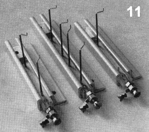 The appropriate wire of the TOU is soldered to the closed switch rail, preferably with "Wescolite", a strong, silver-based solder that is usable at normal soldering temperatures. (The flux, known as AFluxall", is excellent for all small soldering tasks and would be ideal for locomotive superstructures.) The clamp is then replaced by the gap gauges, and the second switch clamped and soldered. The TOU wires, being cranked, can be rotated to give the close fit required. The unit is now operational, and at any convenient time can be given a touch of epoxy adhesive at the joint of the wire and tube to maintain the correct rail height, which is held by the clamp until the adhesive has set.