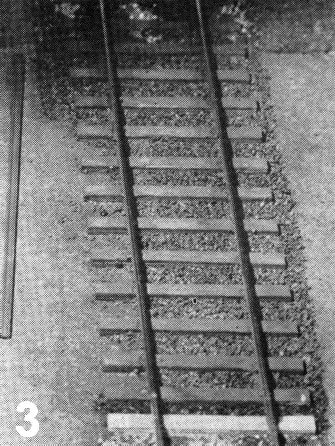 Construction using the full depth sleepers is the same as for normal track. but laying is carried Out on 1/16in cork underlay instead of the normal 1/8in material. Several standard sleepers should be used at the ends of the rail sections, to provide a smooth transition over the underlay joint. Ballast depth may be graded by using several applications of PVA adhesive, and as siding ballast is often in the form of cinders, a dark powder may be used in place of the usual granite chips.