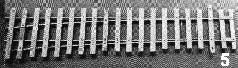 All prototype turnouts have stretcher bars in either round or flat section material, which ensure correct spacing of the switch blades. Lever movement is transmitted via connecting rods. In model operations these bars, when fitted, are usually decorative only and in Protofour the correct switch blade spacing is ensured using the turnout operating unit in conjunction with the switch blade gauges. Protofour stretcher bars are made from 26swg (scale size) nickel silver wire to represent round section bars. The bar ends are accommodated in No 75 or 0.5mm holes drilled in the switch blades. One end of each bar is soldered in its respective hole; the other end has an insulating epoxy coating and is Araldited in place. The switch blades thus remain electrically insulated.