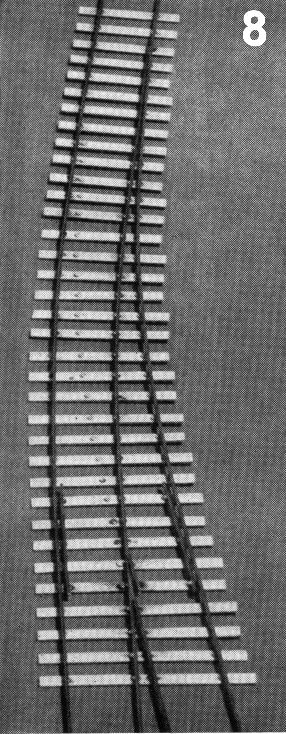 To curve a turnout, assemble the straight turnout in the usual way, omitting one switch and wing rail and leaving the stock rails unsoldered past the switches. Remove the unit from the jig, and using the single closure rail as baseline, curve the unit in position on the baseboard, and secure with drawing pins. Solder the complementary stock rail using Track Gauge, which ensures retention of the curvature, and complete construction on a blank jig.