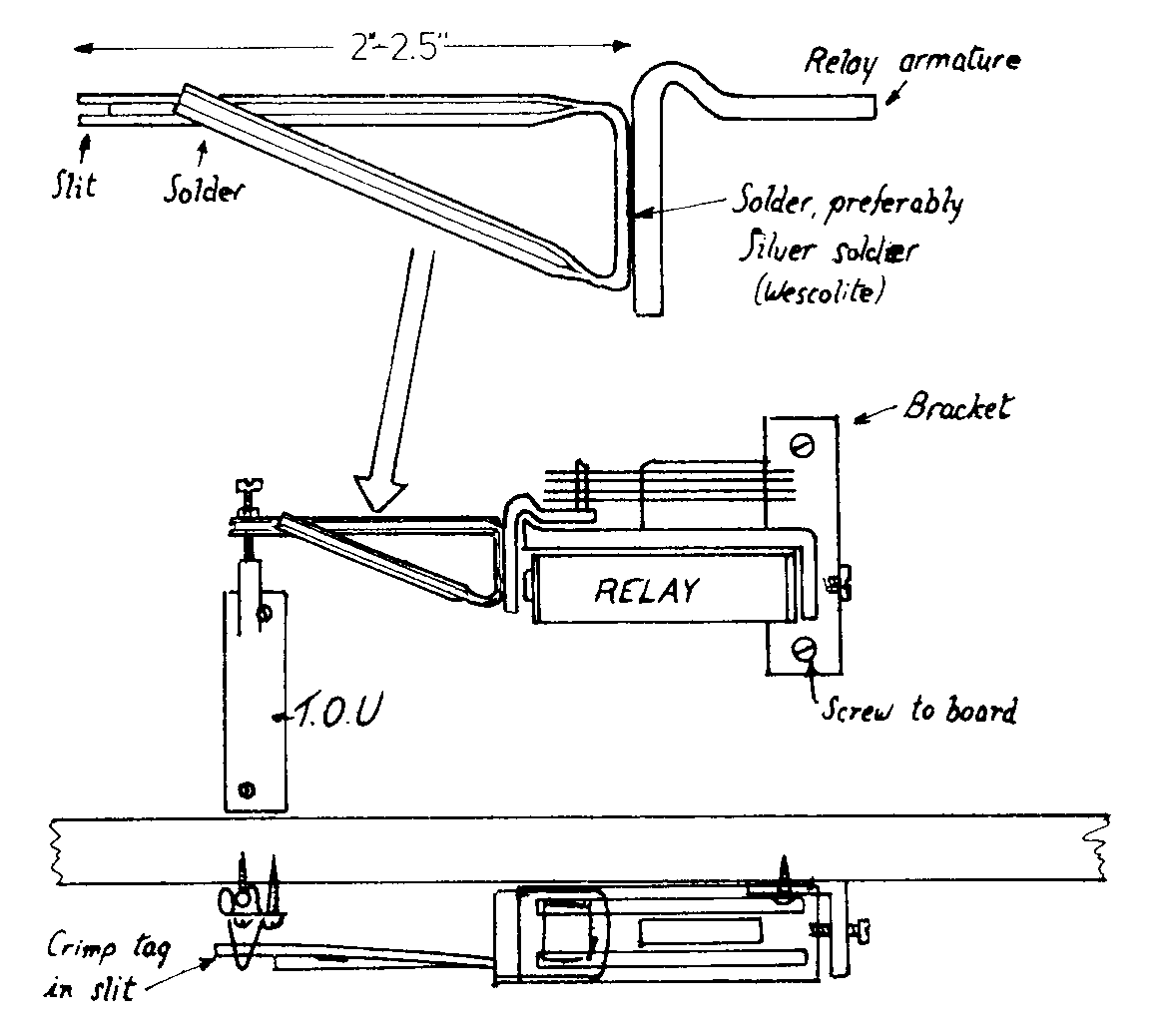 Point operation by Post Office relays.The use of GPO Relays in conjunction with P4 TOUs (Originally published in "Prototype" issue 17, November 1977) My club in Australia managed to purchase a complete telephone exchange of obsolete pattern when it was replaced with a larger one. It cost us $10 to hire a truck and two week-ends labour removing it from site. Amongst other things this yielded over 5000 relays and a vast number of 80 pin plugs and sockets, not to mention enough cable and wire to wire up a telephone exchange! Bearing in mind that H & M and similar point motors cost $4.50 in Australia means had to be found to use these relays instead. Various methods have been devised by members for use on HO layouts and proprietary tracks. For P4 use the scheme described has proved reliable over 2 years use. Basically a triangular extension piece is bent up from P4 rail, soldered to the armature and a slot cut in the end with a razor saw, the tab provided with the P4 T.O.U. is crimped in to the slot. A bracket is required to hold the relay to the baseboard and in my case these were easily sawn out from the chassis of the telephone exchange. If the contact springs of the relay are not required for electrical switching they can be bent to increase the strength of the return stroke, otherwise an additional spring could be used, in most cases, however, a relay with multiple contacts has enough spring strength. |