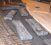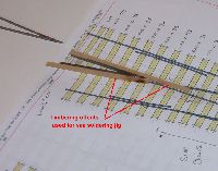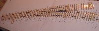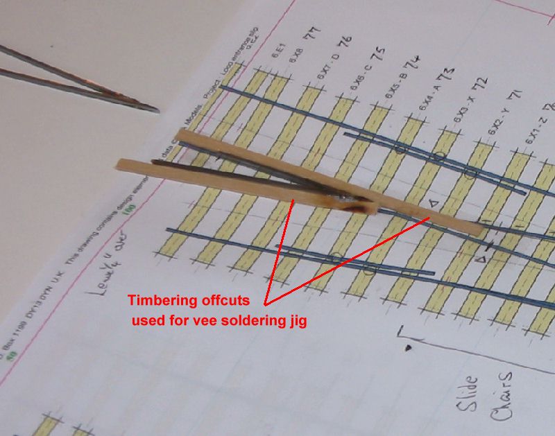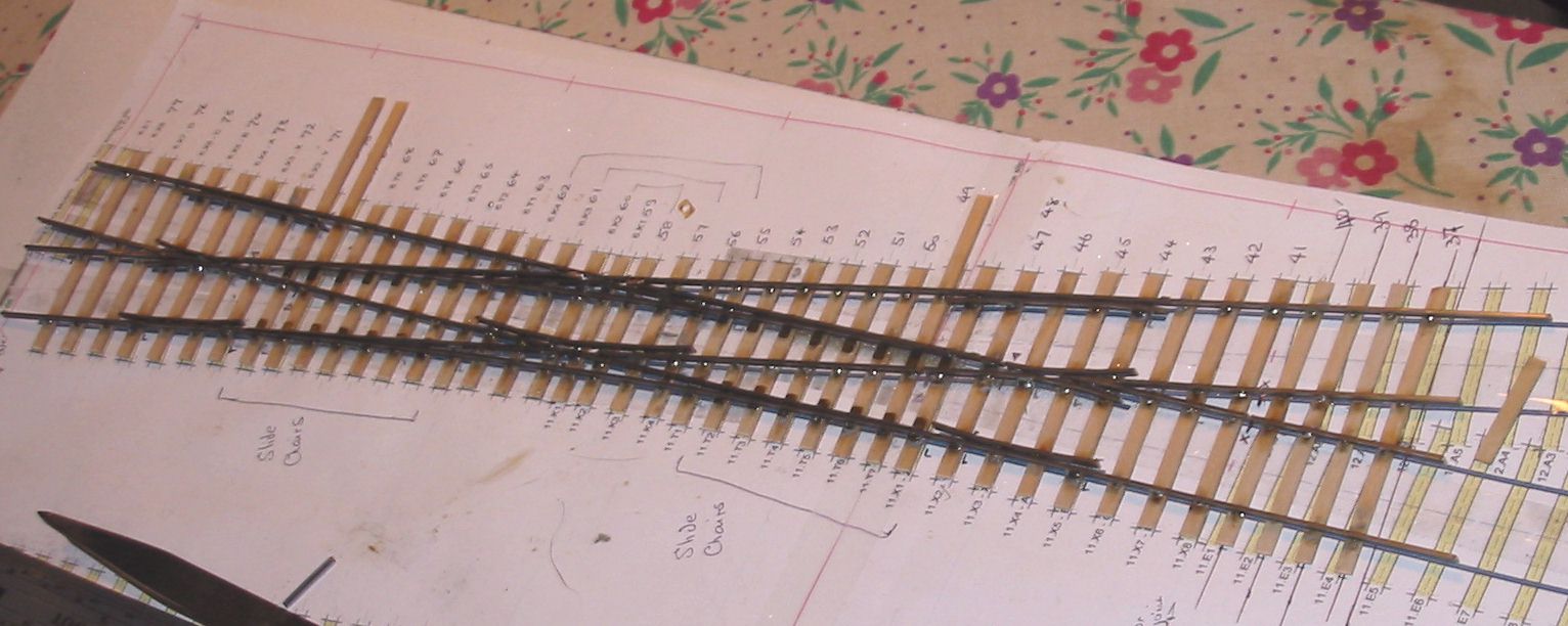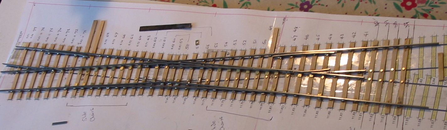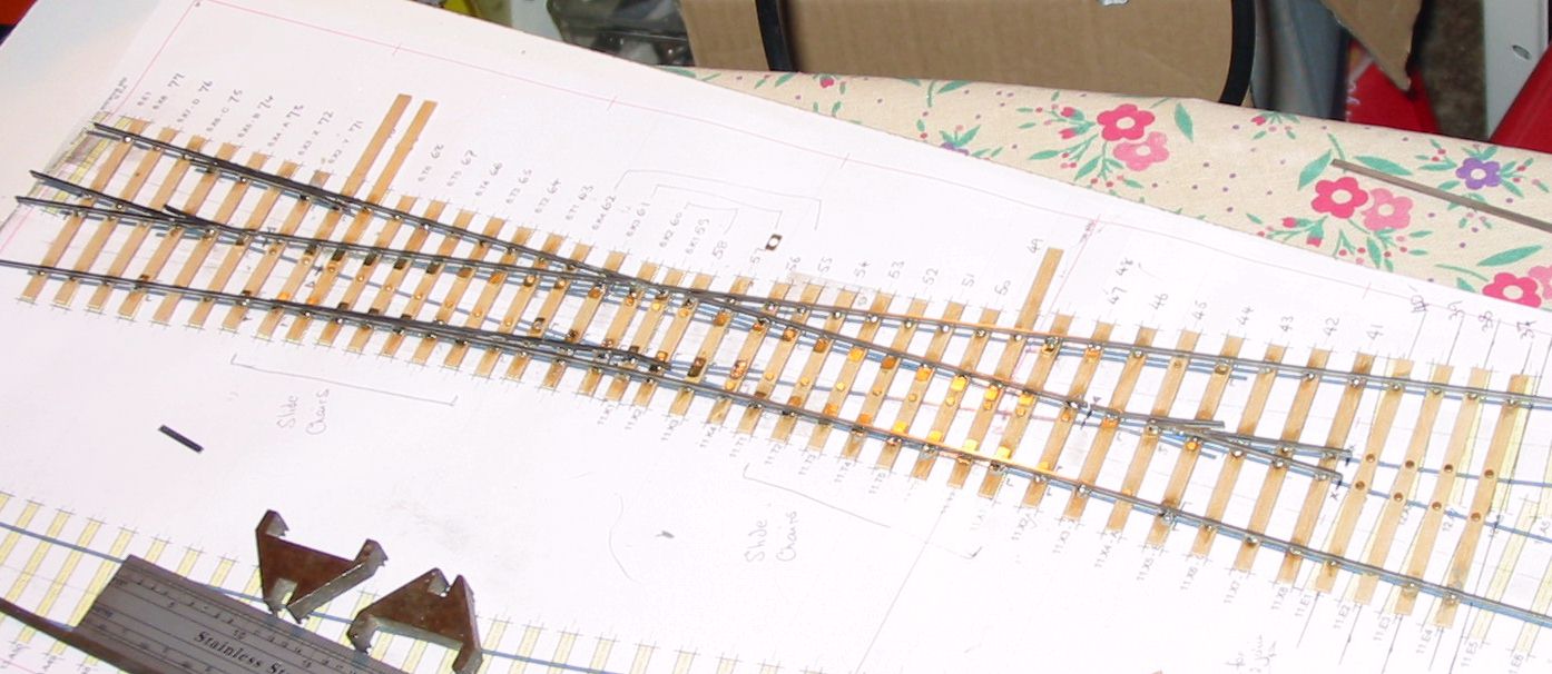 To match the existing track I used traditional ply and rivet construction although my stocks turned out to be low and I had to buy sleepers,and rail from Scalefour stores at the AGM. Pictures 5 through 12 show the sequence of building the single slip and 14 to 18 the curved turnout. I followed my normal practice of using two offcuts of timbering to make a jig for the vees prior to fixing the timbers in place to continue the construction. The point and splice rails are soldered together upside down in this jig. Slide and vee baseplates from Bill Bedford were used and can be seen at strategic locations in the pictures. All soldering used solder paint with the assembly being scrubbed clean under the tap when complete. |