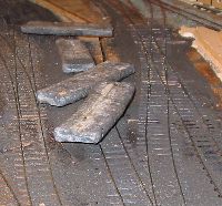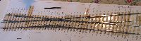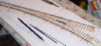 this time using C&L bases with a few ply sleepers at the joints. After this stage and before laying the sleepers were stained. This section of track extends over three boards so the laying and ballasting was done in three sections, one board at a time, the single slip first, then the curved point and siding then lastly the connection replacing the old reverse curve. This is seen in pictures 26 to 28. The formation is covered with a thin layer of the white glue diluted about 50:50 with water and brushed out to cover the desired area. The track is then put in place, located with track gauges at each end and weighted down. The ash ballast is spread over everything and gently tamped down. Once a section has dried surplus ballast is swept up with a 2" paint brush and spooned back into its jar. The remainder that eludes this process is vacuumed up so there is no loose ballast getting in the way when spreading glue for the next section. In picture 29 the third section has not yet been swept and vacuumed as it is not fully dry. The remaining task now is to wire up the new sections and replace the point drive linkages. For this task the three boards are taken out and the work done on the bench. |