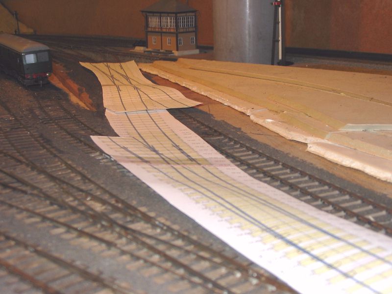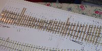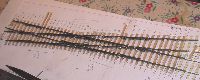 The existing single slip was 1:6 and the alighment had never been correct, so I printed out a 1:7 and tried that, this had an equally bad alignment in the opposite sense where it fitted to the existing tracks at the signalbox end, so I tried again with a 1:6.5 and this proved to be what was required. Pictures 3 and 4 show the resulting printouts laid out over the existing track. |