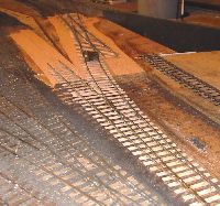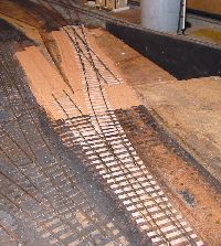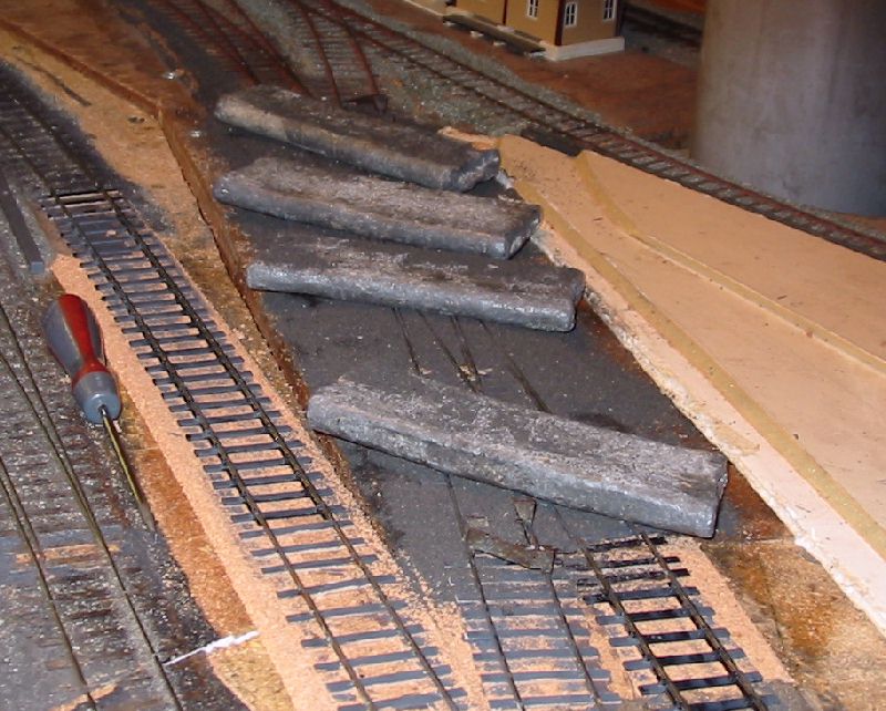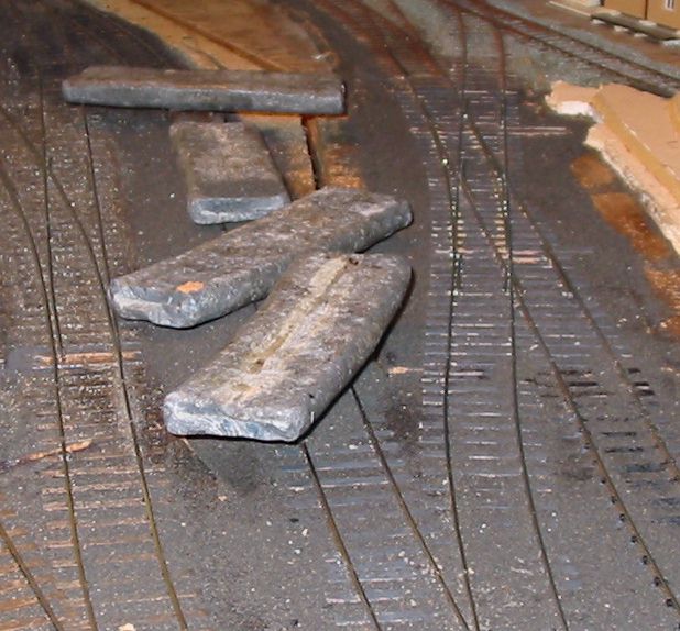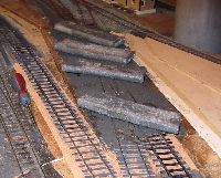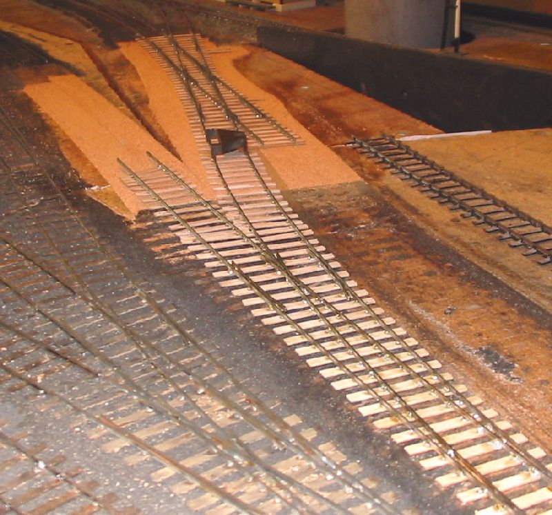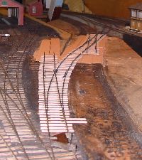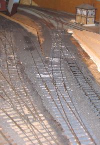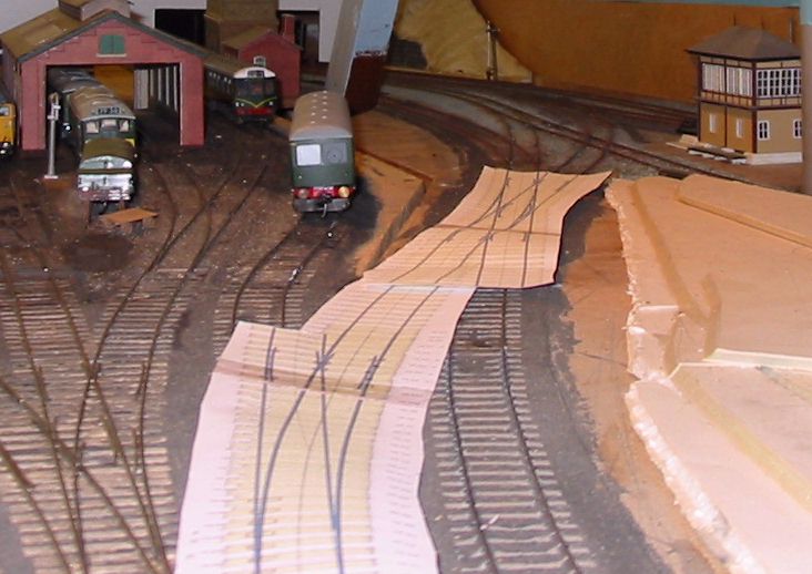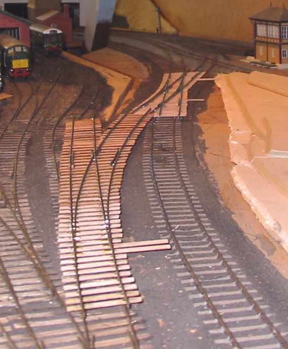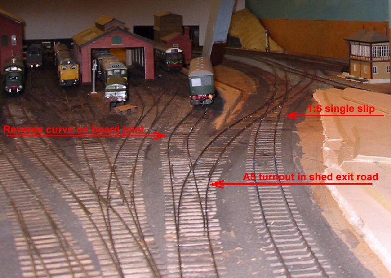 The shed entrance tracks have given an irritating level of derailments with certain locomotives. The single slip started life as a double slip on a different layout and has been patched and mended several times in titsan effort to reduce derailments of locos moving on or off shed.