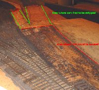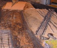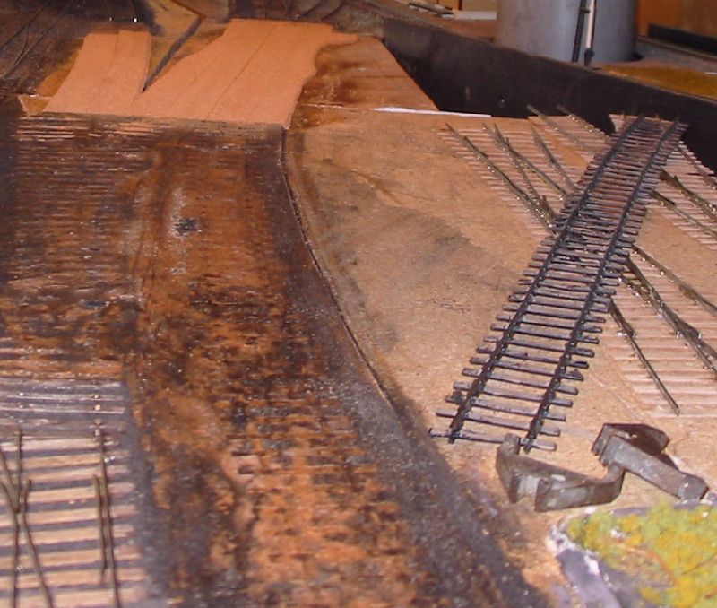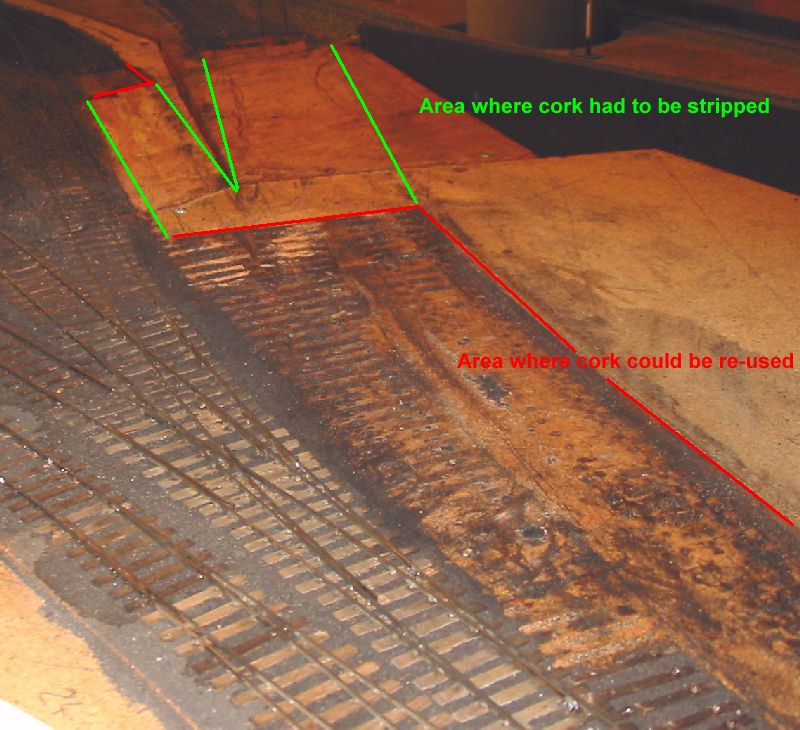 that all was well I got stuck in to site clearance. My track is all stuck to the cork with white glue, originally I used the usual DIY brands which are hard work when lifting track is needed. Now I use children's brands such as that from the Early Learning Centre, designed to wash out of kids' clothing they are much easier to lift should it be needed. In this case I think I had some of each to deal with. Since none of the track was wanted I first unsoldered the rail from the rivets leaving just sleepers and ballast. For this unsoldering I have found my RSU the quickest method. The rails were left in the one siding laid with C&L track as it will easily lift out complete when soaked, the adhesion of the glue to the plastic sleepers is much less than for the ply. The formation was then soaked with water and as the glue softened the sleepers and ballast were scraped up to leave a clean formation. This process uses a combination of chisel and scraper and is something of a struggle. A little over half the area of cork became damaged excessively and was lifted as well. Picture 20 shows the result with an area of clean board and another of existing cork underlay. Picture 21 and 22 show some cork pieces cut to fill the gaps and the track layed out on it. Once the new cork was glued down a Surform was used to blend new and old and get a consistent level. Picture 23 shows the site ready for tracklaying. |