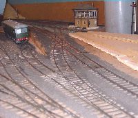 Pictures 1 and 2 show the scene before the start of work. The offending track is the second from the right, heading out over the single slip to join the main line by the signalbox. The siding with the parcels car on also has a nasty reverse curve right on the board joint and it is hoped to improve that as well. |